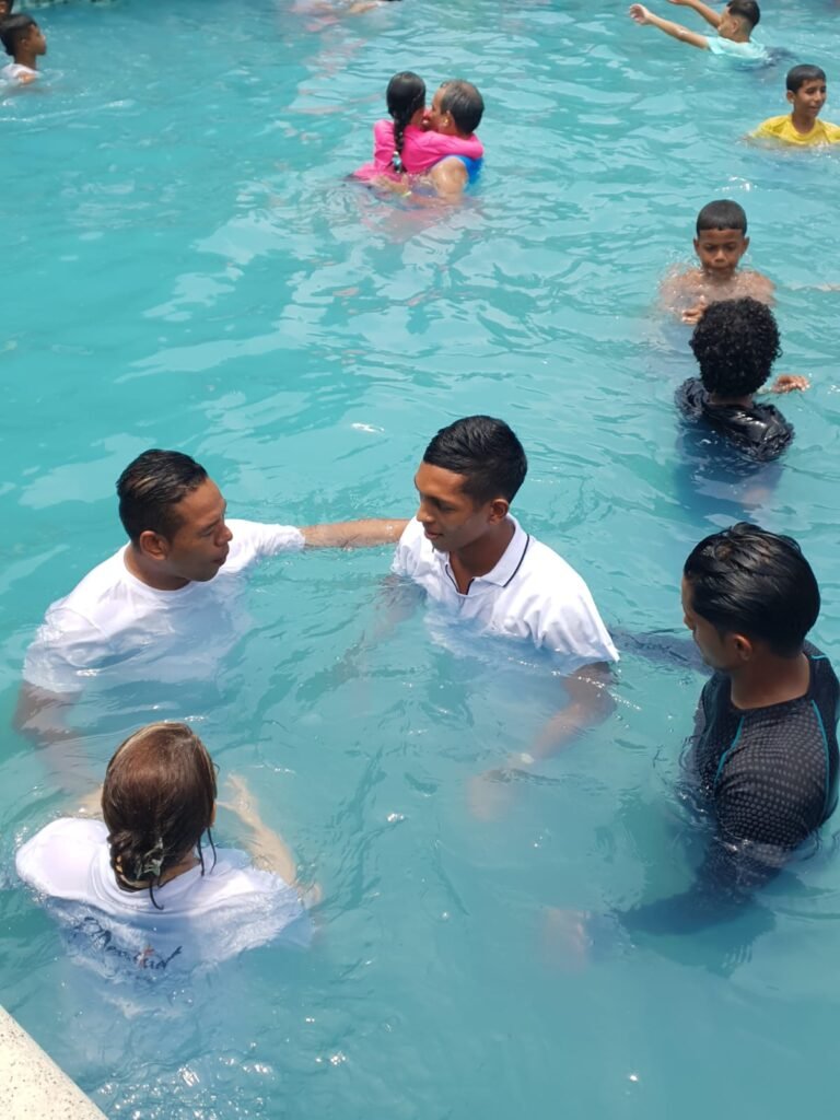Bautizamos a los nuevos discipulos en el Nombre del Padre y del Hijo y del Espiritu Santo tal como Jesús lo enseñó en Mateo 28:19-20
